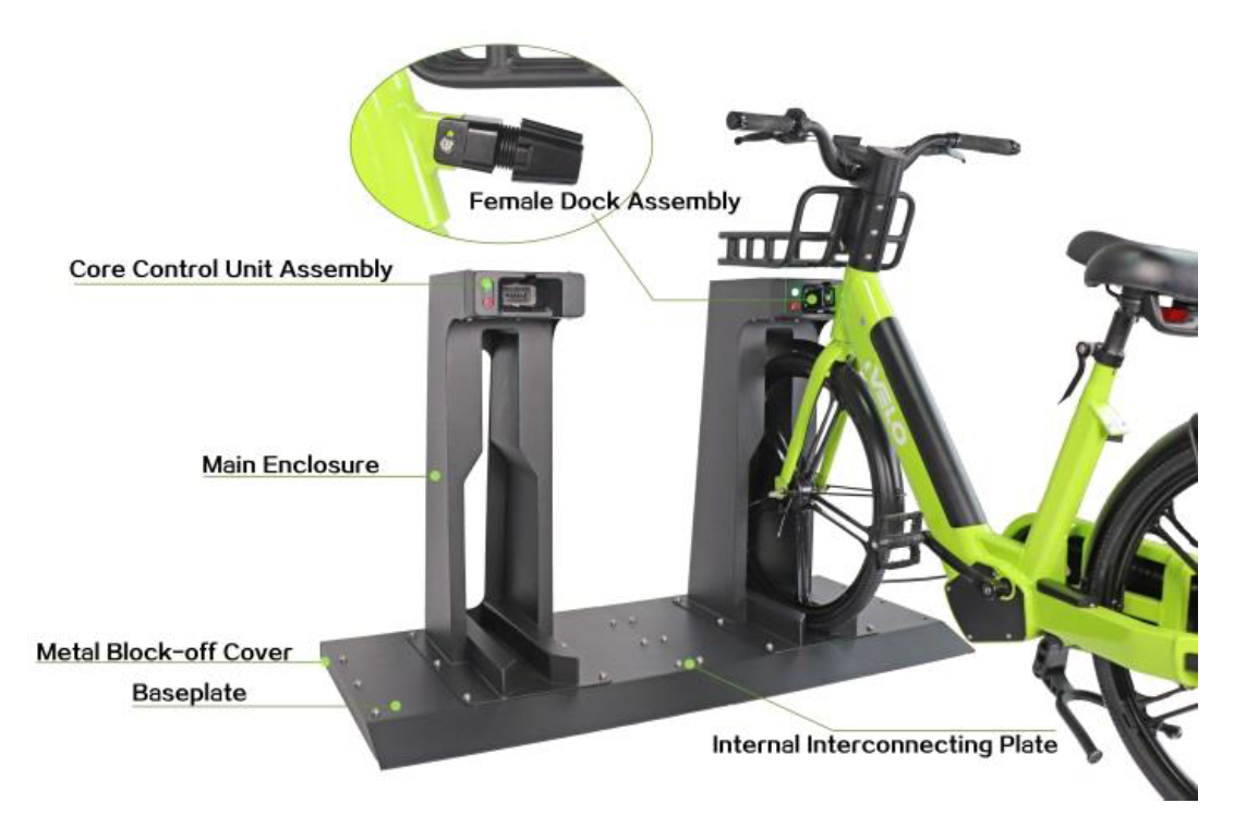 The built-in smart electronic lock detects the vehicle through magnetic sensing and automatically secures it upon docking, while the charging station (with an integrated charger) automatically charges the electric scooter or e-bike.