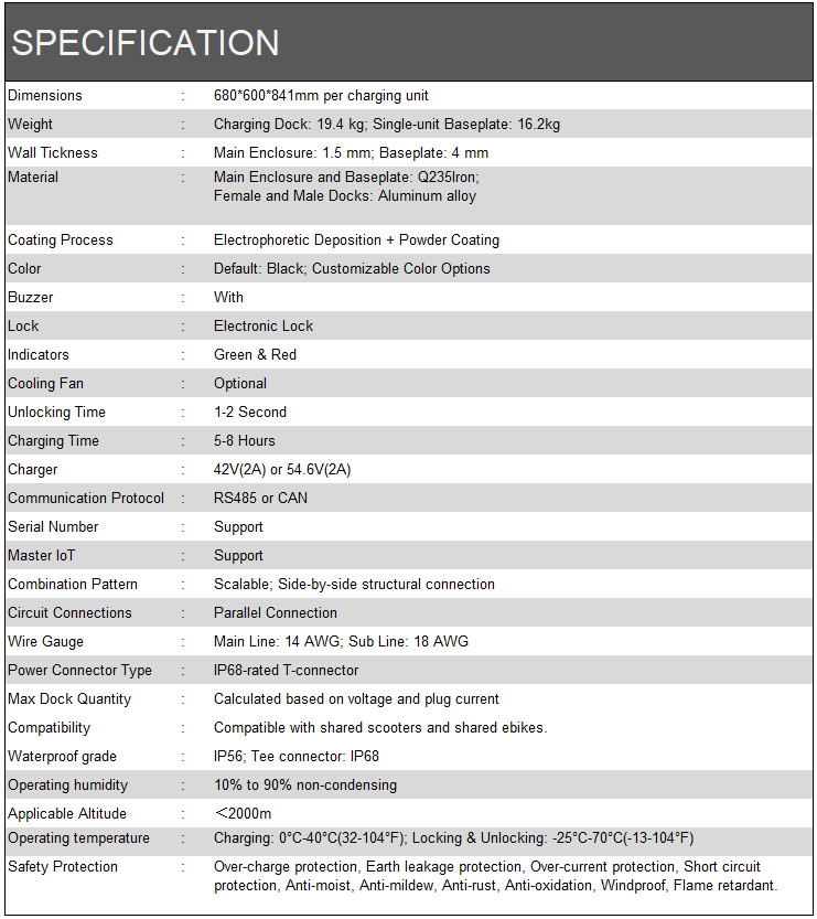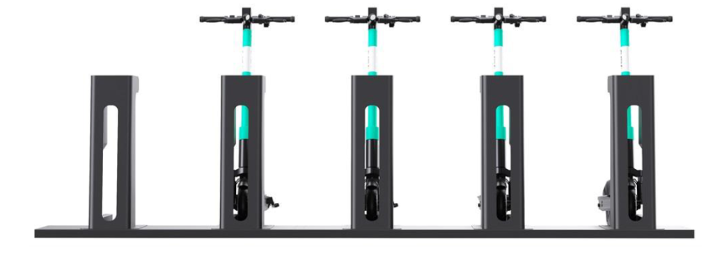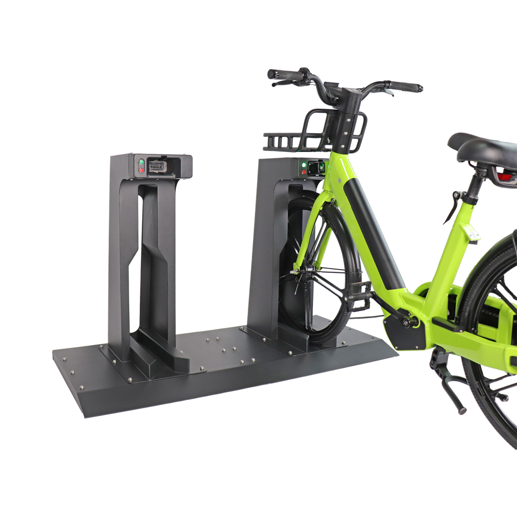 The built-in smart electronic lock detects the vehicle through magnetic sensing and automatically secures it upon docking, while the charging station (with an integrated charger) automatically charges the electric scooter or e-bike.